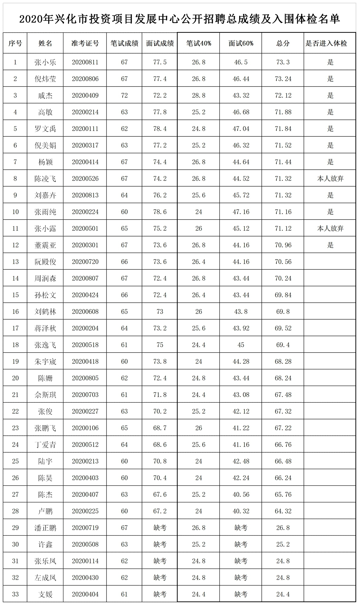 根據(jù)《興化交投人力資源有限公司公開招聘10名工作人員公告》,按招聘計(jì)劃數(shù)1:1的比例從面試合格人員中按總成績(jī)從高分到低分確定參加體檢人員?,F(xiàn)將有關(guān)事項(xiàng)公布如下: