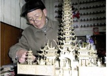 雕塑的4座大殿外面,各有唐僧師徒4人的精巧造型,栩栩如生。高約2厘米的孫悟空活潑俏皮,面部表情豐富,眼皮上鑲嵌了一塊肉眼幾乎看不見的銅片,寓意火眼金睛。豬八戒扛著釘耙,神色憨厚。最絕的是沙僧和唐僧頸項中的佛珠,各有30粒圓珠,每粒不足油菜子大小,用細銅絲穿起,造型逼真。