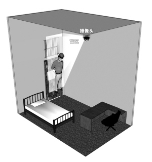 室內(nèi)東南角離地面3.1米處安裝有一斜下視的監(jiān)控探頭,由于這個(gè)探頭安裝位置較高,受監(jiān)控頭視界的技術(shù)指標(biāo)限制,在候問(wèn)室北側(cè)墻體和通風(fēng)門(mén)窗處形成了約14厘米高、面積約為0.16平方米的監(jiān)控盲區(qū)。邢鯤正是在這一監(jiān)控盲區(qū)上自縊的。